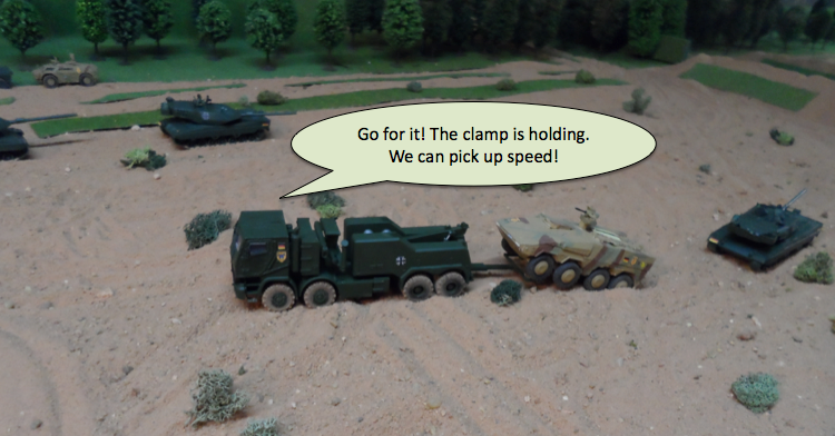 A BOXER pulled by an Actros BISON and a LEOPARD tank pulled by an ARV.
